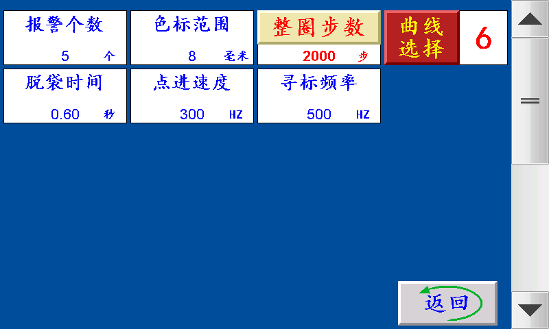 三、主页 ![]() 长度设定:显示制袋所设定长度,单位:毫米(也可以当按键直接调节长度) 送料间隔时间:每次伺服(步进)电机转结束后间隔N时间下次伺服(步进)电机转。 主机速度:控制主机加减速快慢。 计数/清零:单批次累计到一批个数结束时,个数自动归零;按“计数/清零”键清零清个数。 批数/清零:一批结束后,批数加“1”, 总数/清零:个数每加一个,总数加“1”;按“总数/清零”键清零总数。 空白/深色/浅色:三种状态切换。 空白:指光电忽略色标光电传感器信号; 深色:指跟踪印刷制品时,以深颜色的色标点为跟踪点; 浅色:指跟踪印刷制品时,以浅颜色的色标点为跟踪点。 寻标:当‘寻标’键选择“深色/浅色”时按此键,伺服(步进)电机一直转到深色的色标点自动停转时,设置为“追深”;伺服(步进)电机一直转到浅色的色标点自动停转时,设置为“追浅。 当‘寻标’键选择“空白”时,按此键无效 点进:在停止状态下,手动伺服(步进)电机正转。 点退:在停止状态下,手动伺服(步进)电机反转,在运行状态下此键变为“补数”,按此键计数减1。 复位:系统不能正常工作时,按此键程序重新启动,也可以做紧急停机用。 运行:按此键,主机正常运行。(长按3秒左右) 停止:按此键,霍尔开关GK1检测到高位停机信号;主机自动停机。 状态显示:运行/停止/超速/暂停/脱标/断料,六种状态切换显示。 运行:按启动键后显示“运行”。 停止:通电后一直显示“停止”。 超速:主机速度过快步进(伺服)电机送料还没有结束时,主机停机显示“超速”。 暂停:当机型选择“暂停”时一批结束停机N秒后主机自动开机。 脱标:在制作印刷制品时没有跟踪到色标点显示“脱标”。 断料:当主机运行,X15检测到断料信号时,蜂鸣器报警,主机停机,显示故障“断料”。主机停止状态下X15检测到断料信号时,蜂鸣器报警,显示故障“断料”。(按“停止”清除故障) 四、设置 ![]() 不停/暂停/停机:“不停”:一批结束主机不停,继续正常工作。 “暂停”:一批结束主机暂停,停到暂停时间结束,主机自动开机。 “停机”:一批结束主机自动停机后不再运行,手动按启动键方可运行。 恢复出厂:按此键恢复出厂设置(慎用)。 副菜单:点击此键进入副菜单界面。 整本预置:一批设定的个数,提前5个报警。单位:个 送料速度:伺服(步进)电机的加减速时间,设定越大,伺服(步进)电机起步越快。 胶辊周长:伺服(步进)电机带动橡胶辊转一圈的长度。 暂停时间:当机型选择暂停,一批结束后主机自动停机所设定的时间。 频率上限:伺服(步进)电机的最高转速,设定越大,伺服(步进)电机的转速越快。 屏保时间:主机运行状态下,在主界面停留此时间进入屏保状态。(设置0则屏保无效) 五、副菜单 ![]() 色标范围:制作彩色制品时,伺服(步进)电机以恒定的速度寻找色标点的范围(即色标光电在『长度—设定的色标范围长度』范围内寻找色标,寻至『长度+设定的色标范围长度』。 报警个数:一批结束前提前N个报警。