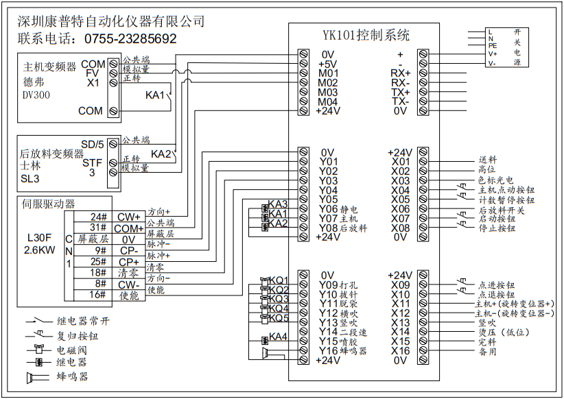 一、概述 YK-101控制系统为全数字触摸式控制系统,该系统采用高性能芯片.7寸液晶显示屏.触摸屏等高数字化产品。外观独特,界面新颖,操作简单,抗干扰能力极强。现已广泛用于塑料制袋机、横切机、全自动无纺布制袋机.全自动编织袋制袋机、圆织机等领域。 本系统输入16个点(包括2路高速测速端口),输出16个点,外加4路模拟量输出。可同时控制主电机(三相异步电机)送料电机(伺服电机或步进电机),放料电机(直流电机或三相异步电机),实现真正意义上的三个电机同步运行。即全自动加速功能,主机速度和后放料速度数据同时换算后速度自动分配。