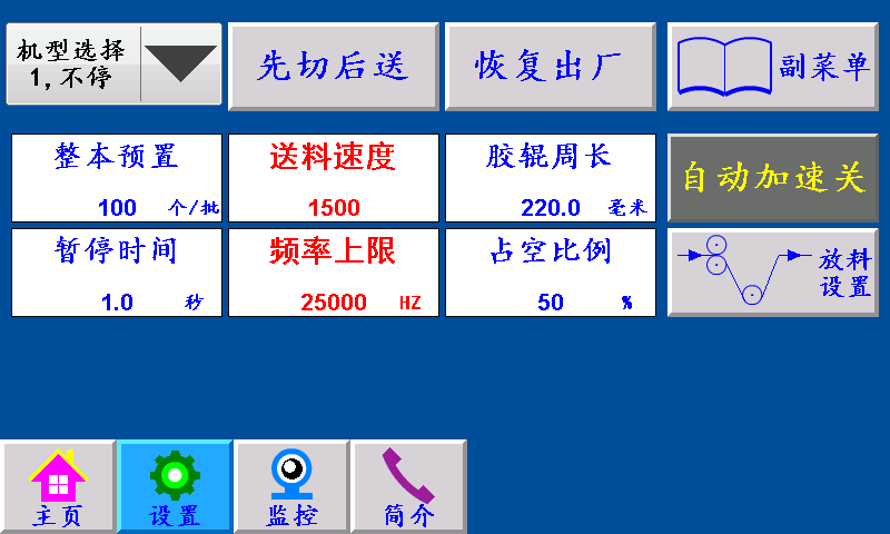“停机”:一批结束主机自动停机后不再运行,手动按启动键方可运行。先切后送/先送后切:“先切后送”:按启动键,主机先运行,GK1霍尔开关检测到伺服(步进)电机的送料信号,伺服(步进)电机开始送料。 “先送后切”:按启动键,伺服(步进)先送料,送料结束后主机再运行。 放料设置:点击此键进入放料设置界面修正当前主机模拟系数。 恢复出厂:按此键恢复出厂设置(慎用)。 副菜单:点击此键进入副菜单界面。 整本预置:一批设定的个数,提前5个报警。单位:个 暂停时间:当机型选择暂停,一批结束后主机自动停机所设定的时间。 送料速度:伺服(步进)电机的加减速时间,设定越大,伺服(步进)电机起步越快。 频率上限:伺服(步进)电机的最高转速,设定越大,伺服(步进)电机的转速越快。 胶辊周长:伺服(步进)电机带动橡胶辊转一圈的长度。 占空比例:“自动送料”时,主机运行一个周期送料所占的时间比例。