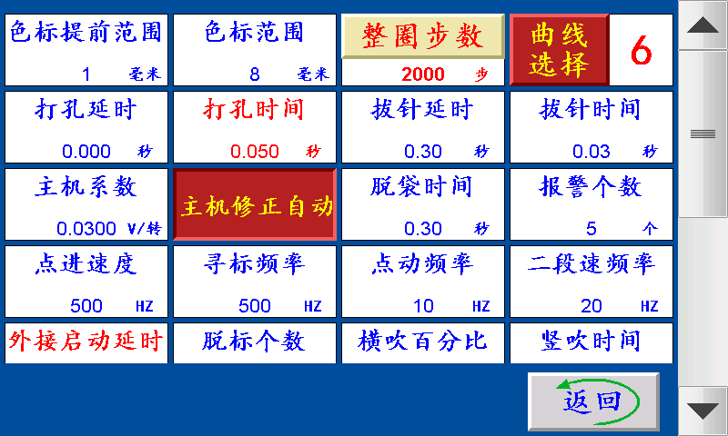 脱标个数:设定N个,制作彩色制品时,跟踪N次色标点,跟踪不住自动停机。 屏保时间:主机运行状态下,在主界面停留此时间进入屏保状态。(设置0则屏保无效) 停机回缩长度:每次停机后,送料往回缩的长度 停机空切个数:每次停机时,主机需要空切的次数。 整圈步数:伺服(步进)电机转一圈所需要的脉冲个数。 曲线选择:1~9,步进电机默认1,伺服电机默认6 主机系数:控制主机速度快慢。 主机修正手动/主机修正自动: 主机修正手动:手动调节主机系数来改变主机速度 主机修正自动:自动修正好主机速度对应的主机系数大小。