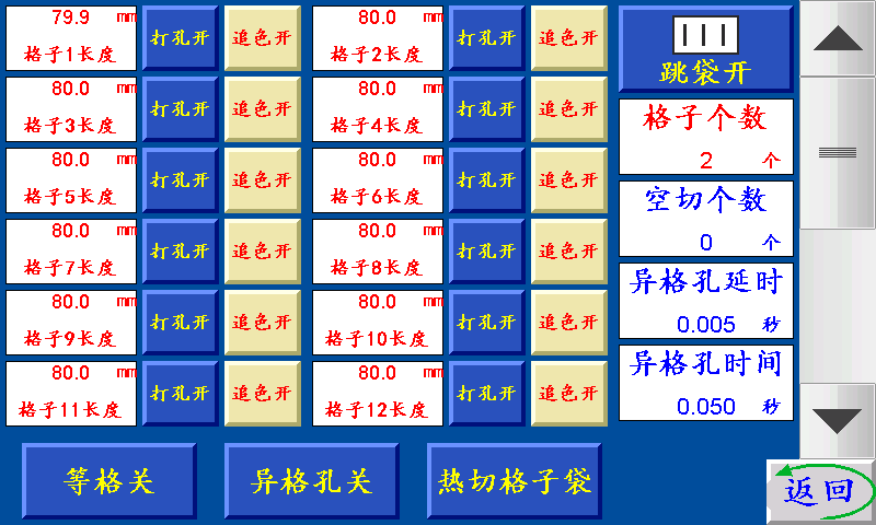 异格孔开/关:控制是否需要输出异格孔信号。 跳袋开/关:控制是否需要开启跳袋功能。 热切格子袋/平口格子袋: