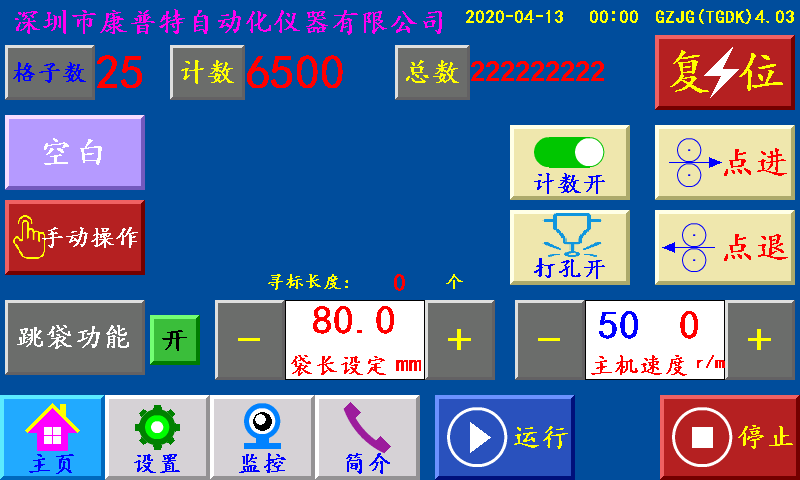 本系统输入16个点(包括2路高速测速端口),输出16个点,外加4路模拟量输出。跳格程序主要用于多格打孔,拥有两组打孔信号,两组打孔信号可单独控制每格送料结束后是否需要打孔输出。当送完设定格子数时,主机再将料切断。
